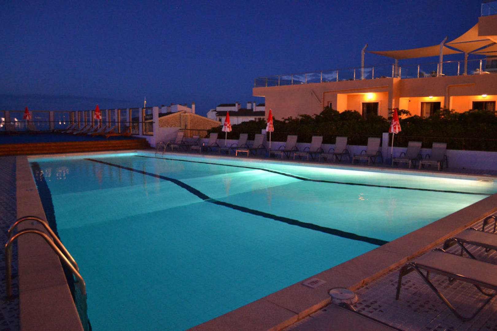 Auch am Abend noch kann man bei entsprechenden Temperaturen draussen sitzen - im Poolbereich, der sich direkt an den Barraum anschliesst... mit Blick auf's Meer kann man den Tag ausklingen lassen mit einem kräftigen Sangria...