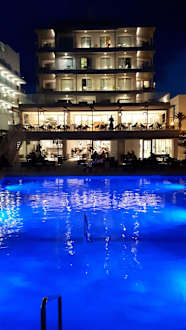 Bei Nacht Pool mit Hotel im Hintergrund