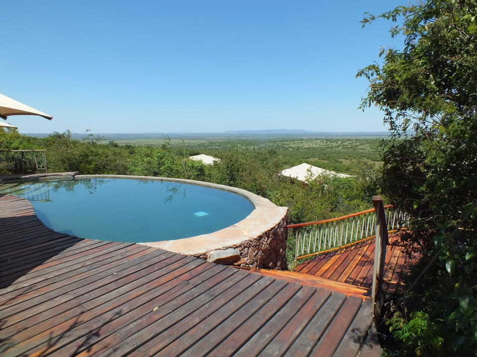 Das Bild zeigt den Blick von der Rezeption aus auf den Pool.