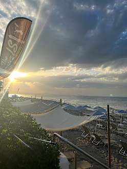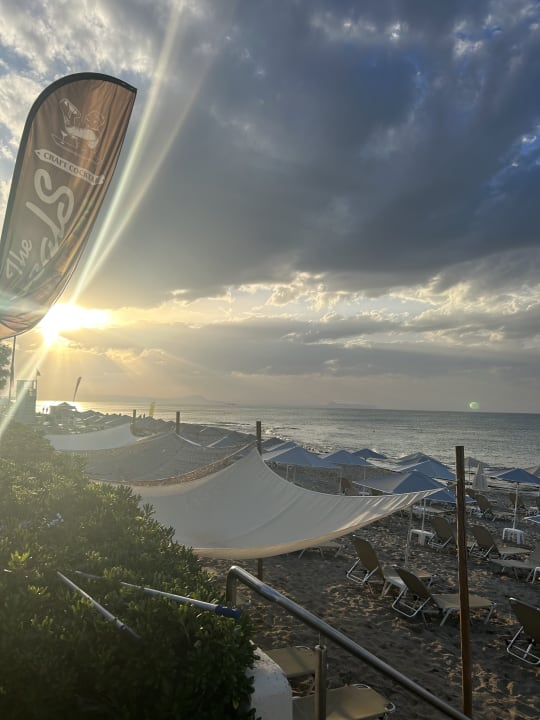 Ausblick von der Bar an den Strand bei Sonnenuntergang.