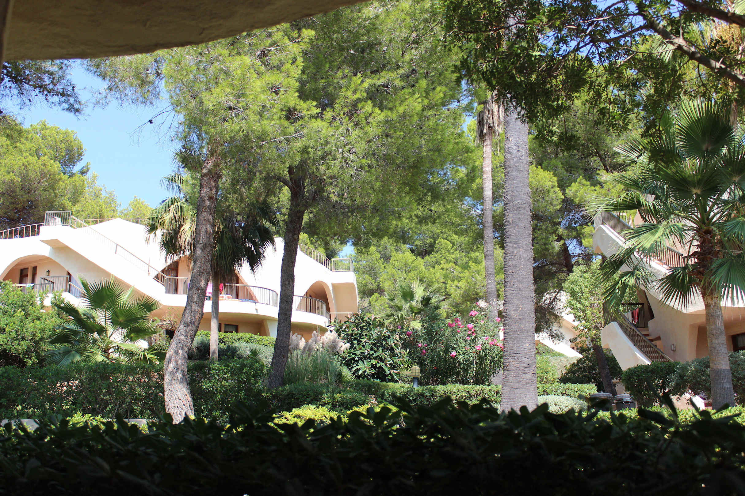 Unser ebenerdiges Zimmer hatte eine Terrasse, gesäumt von einer Hecke. Wenn man stand, konnte man über die Hecke schauen zu den benachbarten Bungalows und zur Poolanlage.