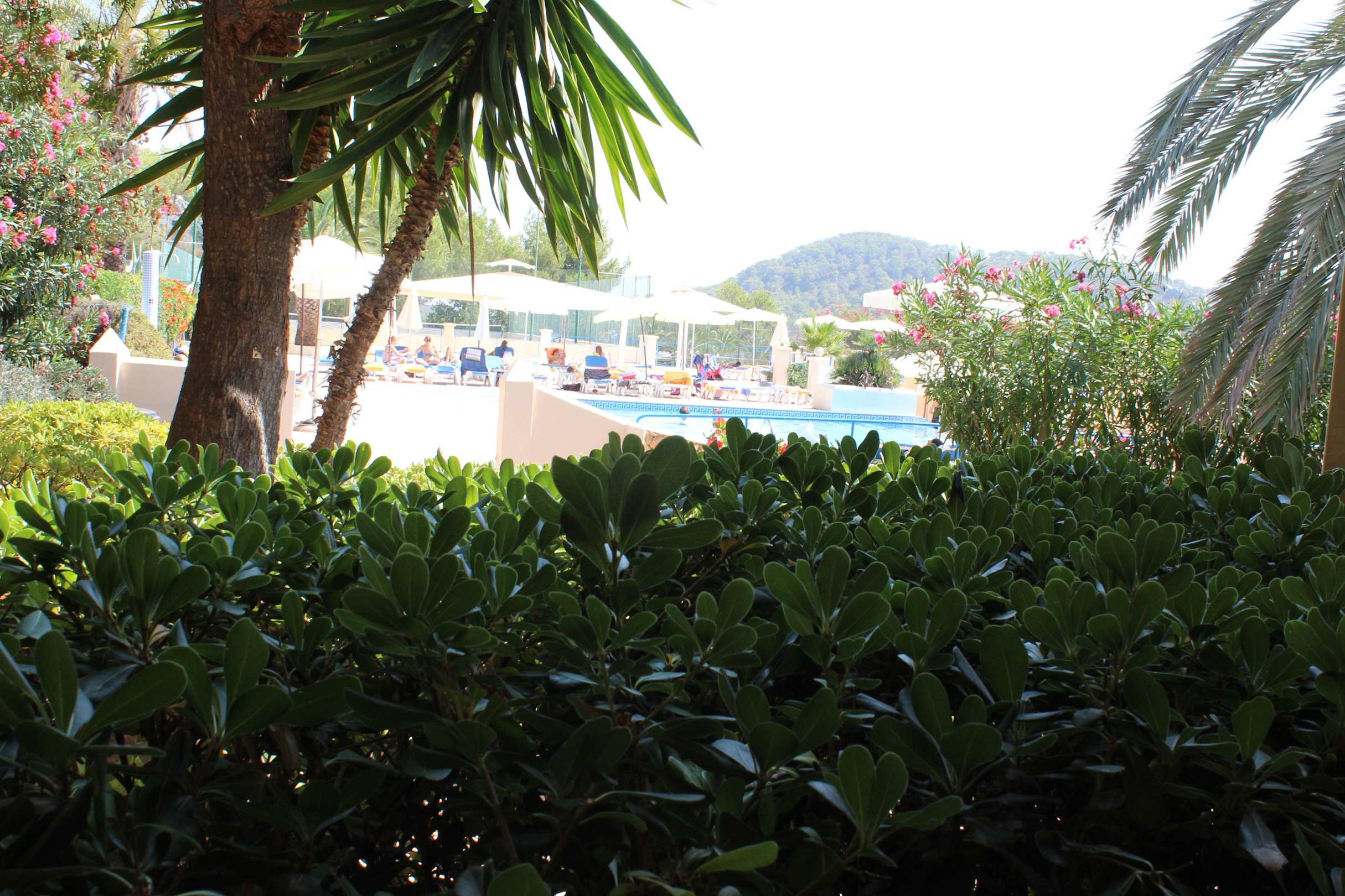 Unser ebenerdiges Zimmer hatte eine Terrasse, gesäumt von einer Hecke. Wenn man stand, konnte man über die Hecke schauen zu den benachbarten Bungalows und zur Poolanlage.