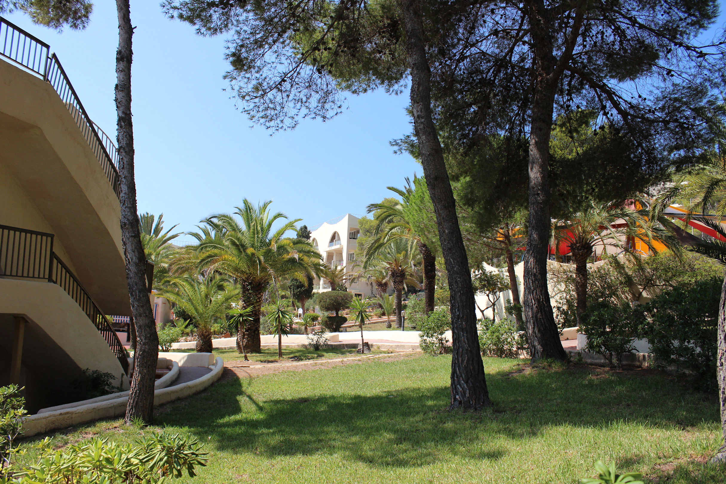 Schöne gepflegte Gartenanlage rund um die Bungalows herum. Oben rechts sind die Sonnensegel des Spielplatzes zu sehen.