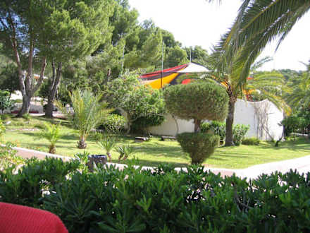 Gartenanlage mit KinderspielplatzIm Hintergrund ist der mit einem farbigem Segel überdachte Kinderspielplatz zu sehen.