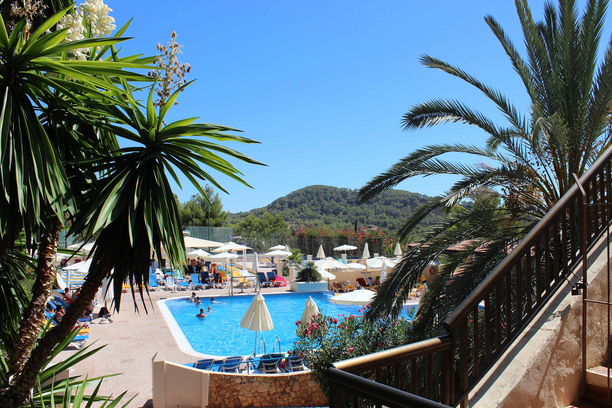 Das Foto wurde aus der 2. Etage unseres Bungalows gegenüber der Poolanlage aufgenommen und zeigt den oberen Bereich des terrassenförmigen Pools (ca. 1,40cm tief)