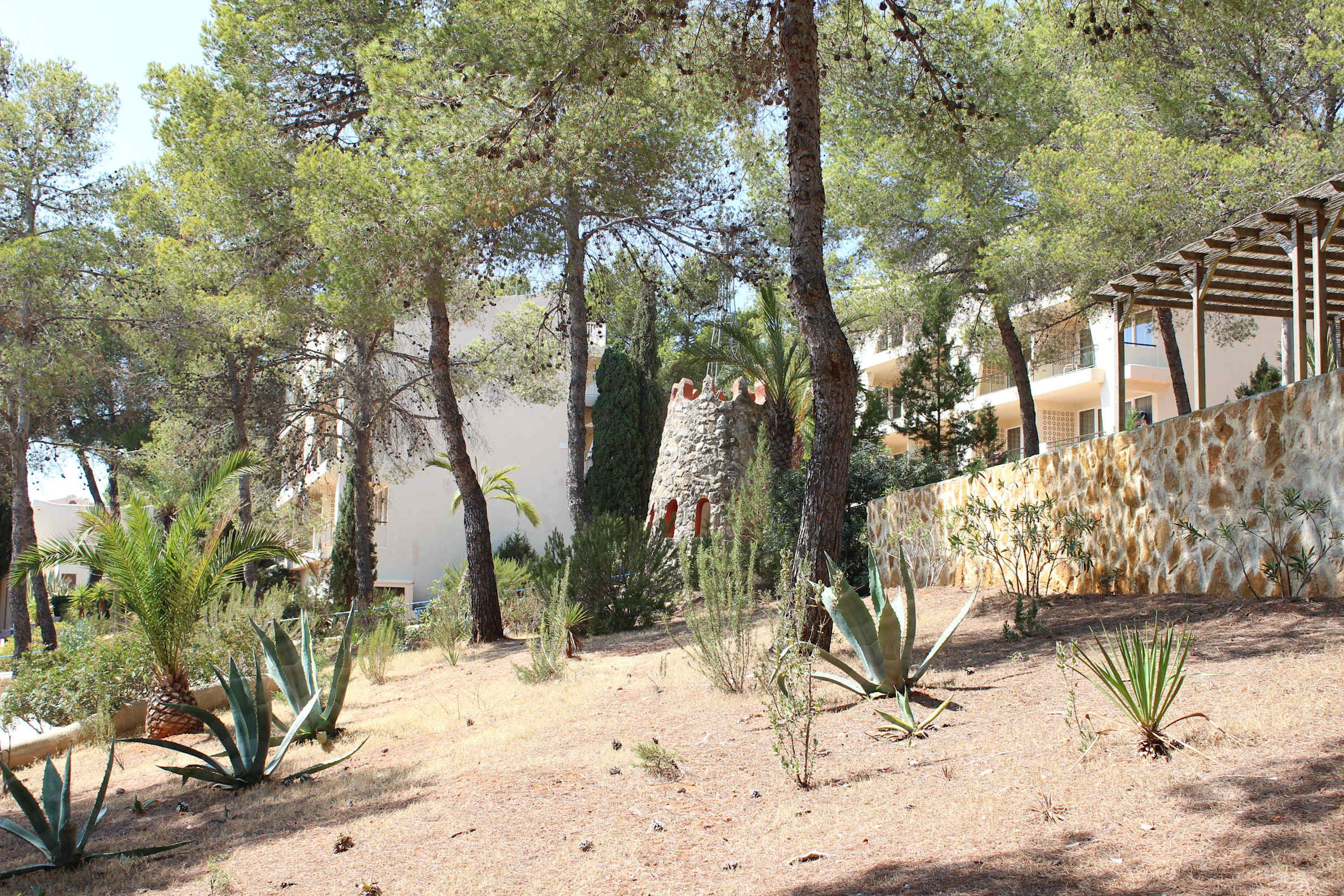 Von der Steinterrasse aus hat man einen herrlichen Ausblick nach San Antonio und zur Bucht. Daneben steht noch ein kleines Türmchen.
