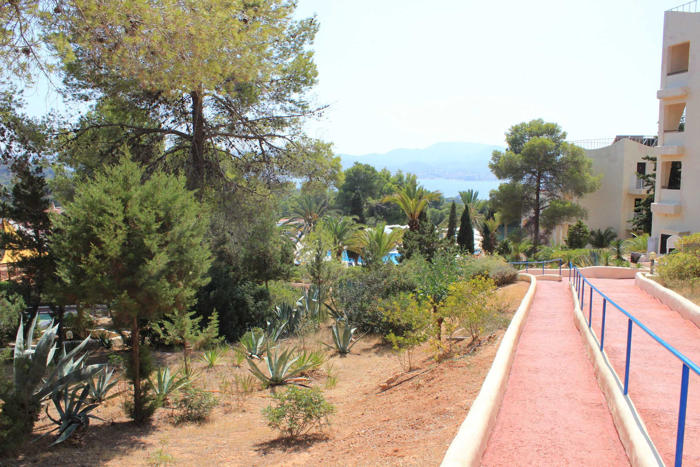 Rampe und Treppe mit breiten flachen Stufen und Handlauf führen zu den höher gelegenen Bungalows. Da kommt man schon mal aus der Puste. Dafür wird man mit einem herrlichen Ausblick belohnt.