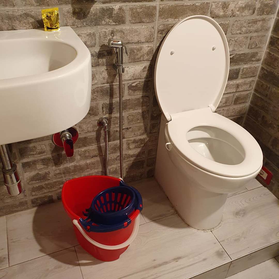 Zi.-Nr. 5: Neben der Toilette steht der besagte Eimer, womit man das darin befindliche Wasser zum Herunterspülen der Notdurft in die Toilettenschüssel gießen musste. Oder man benutzt den Wasserschlauch. Vorsicht: Vernebelungsgefahr!