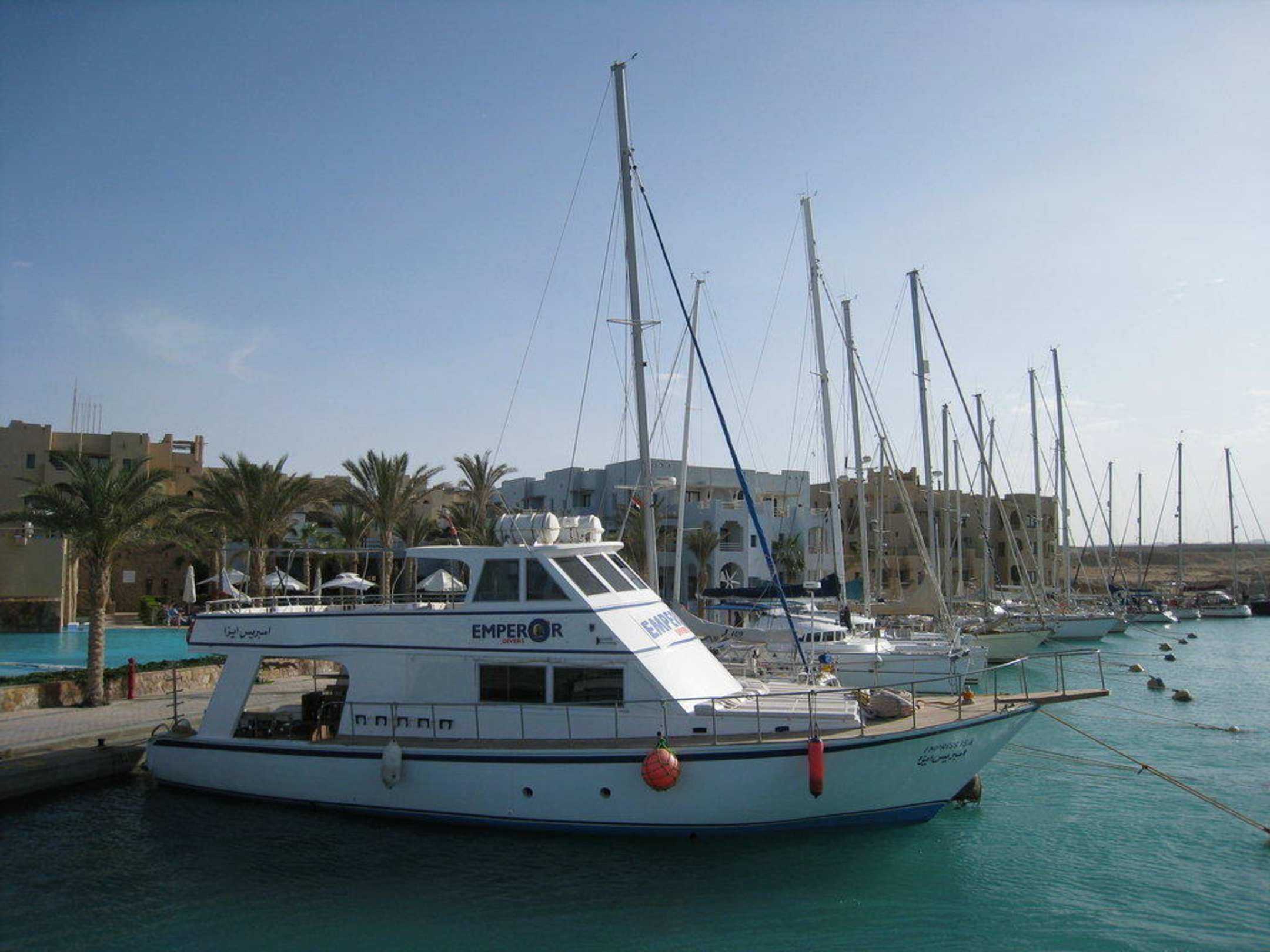Tauchboote am HotelDie Flotte der Emperor Divers liegt direkt am Hotel, neben Seegelbooten internationaler Gäste.