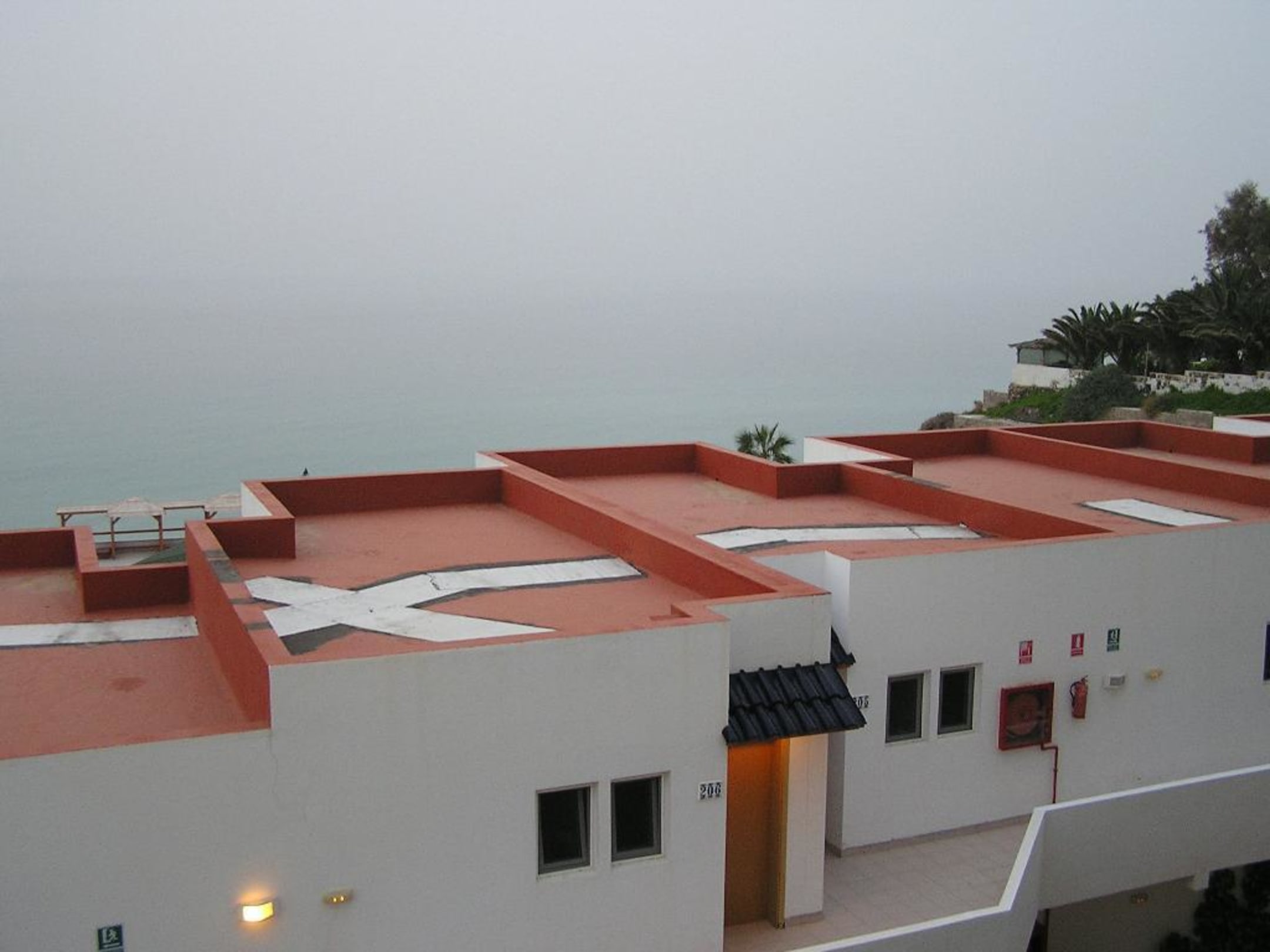 Blick vom Zimmer/Balkon über das Nebengebäude zum Meer