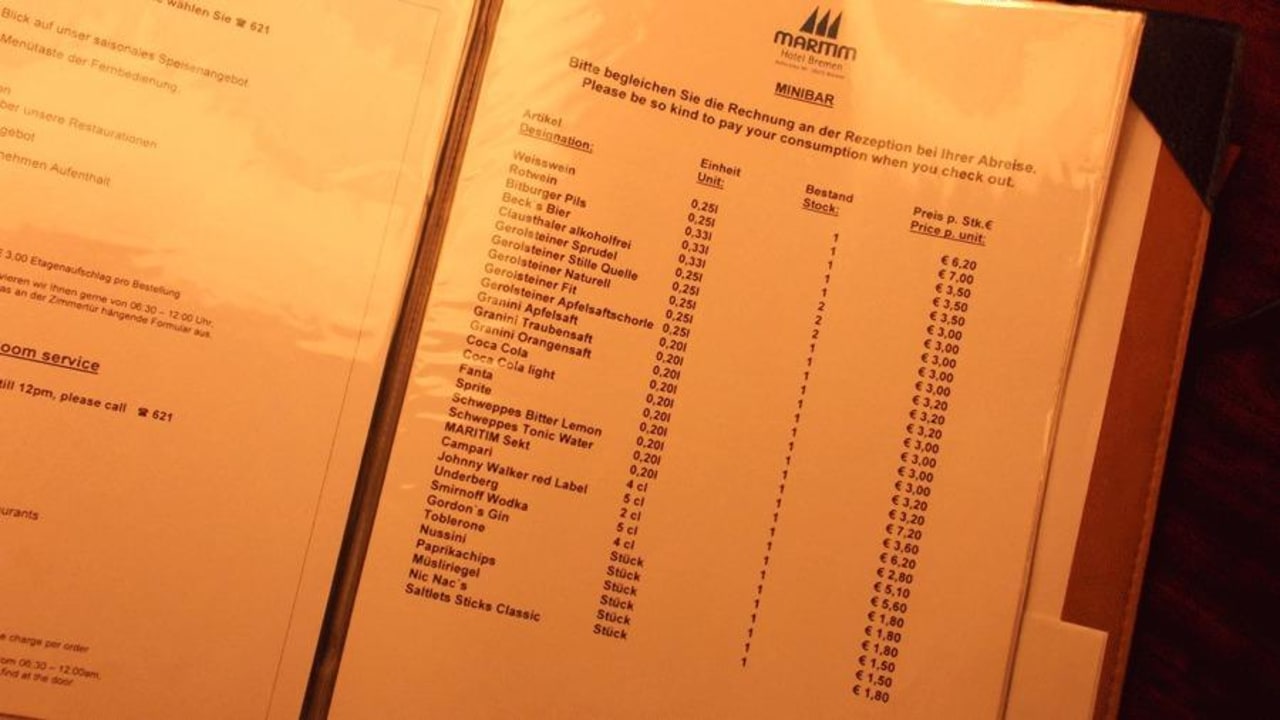Übersicht über die Preise der Minibarartikel.