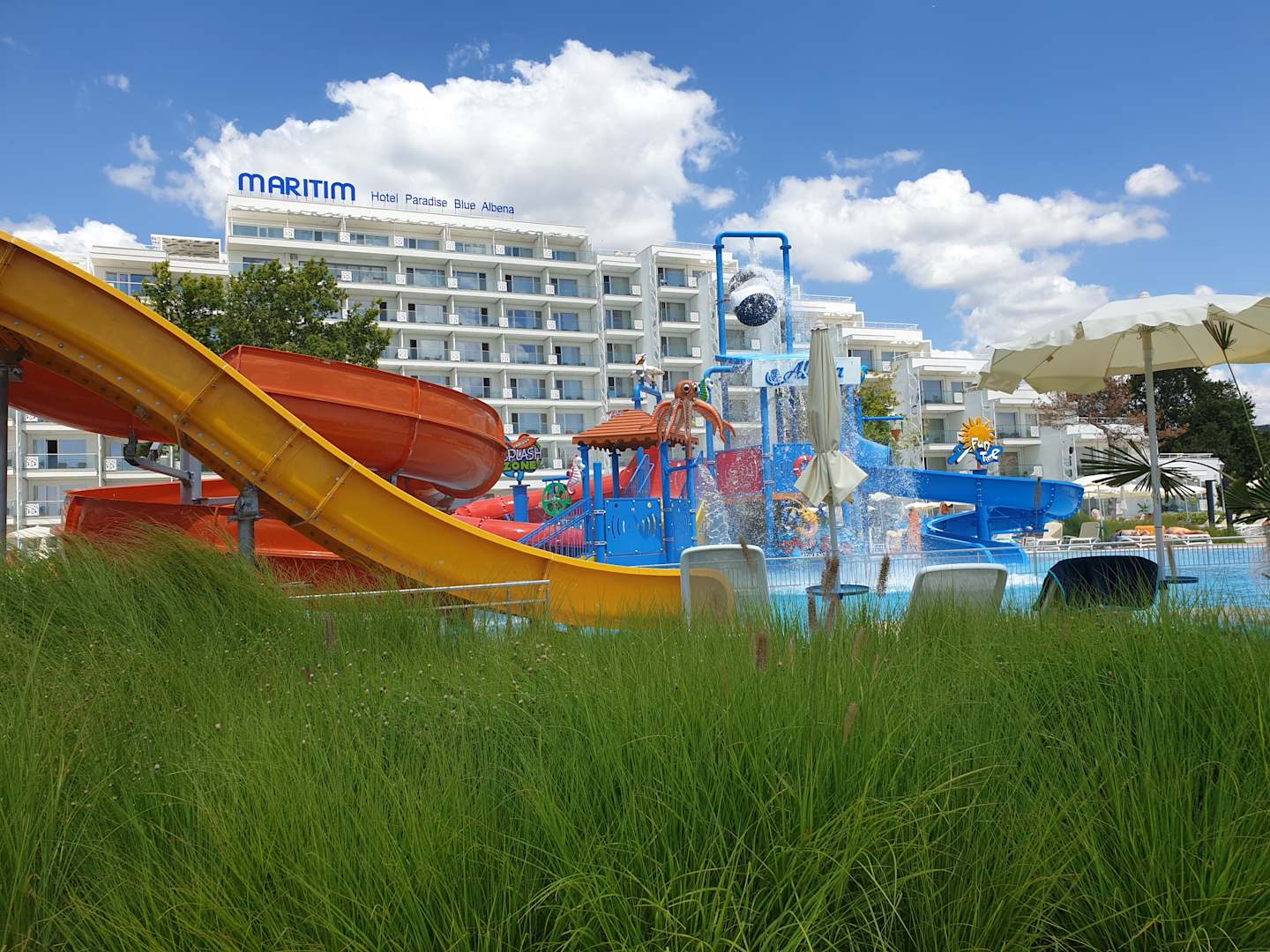 Blick vom Strand auf den Pool mit den Wasserrutschen