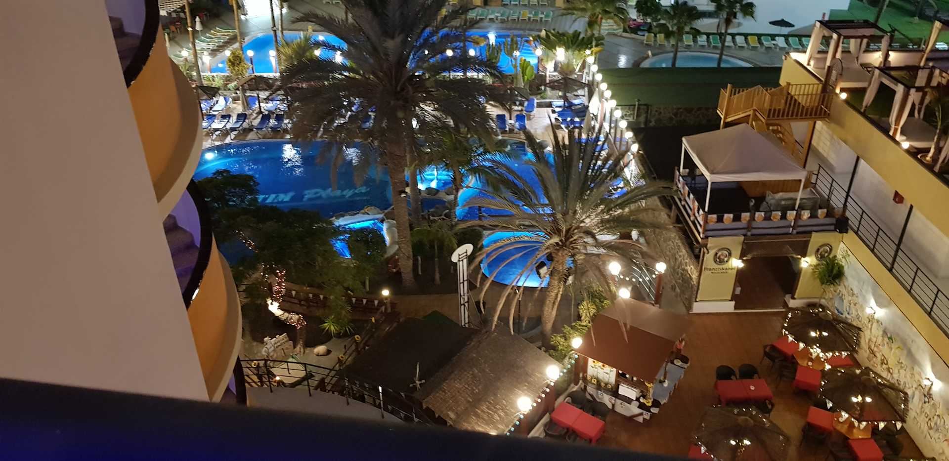 Poolanlage und Poolbar am Abend