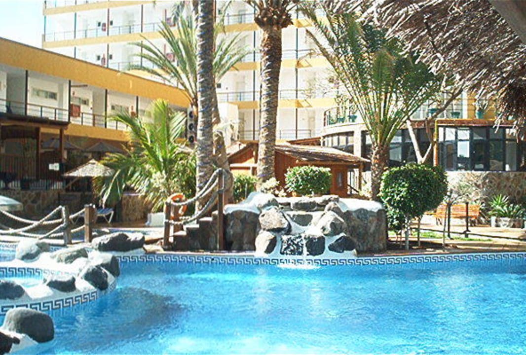 vom Pool aus aufgenommen , Rückseite des Hotels. die Linke App. Seite wohnt praktisch über der Disco Pacha. Auf dem Dach der linken App. Seite befindet sich eine große Dachterasse.