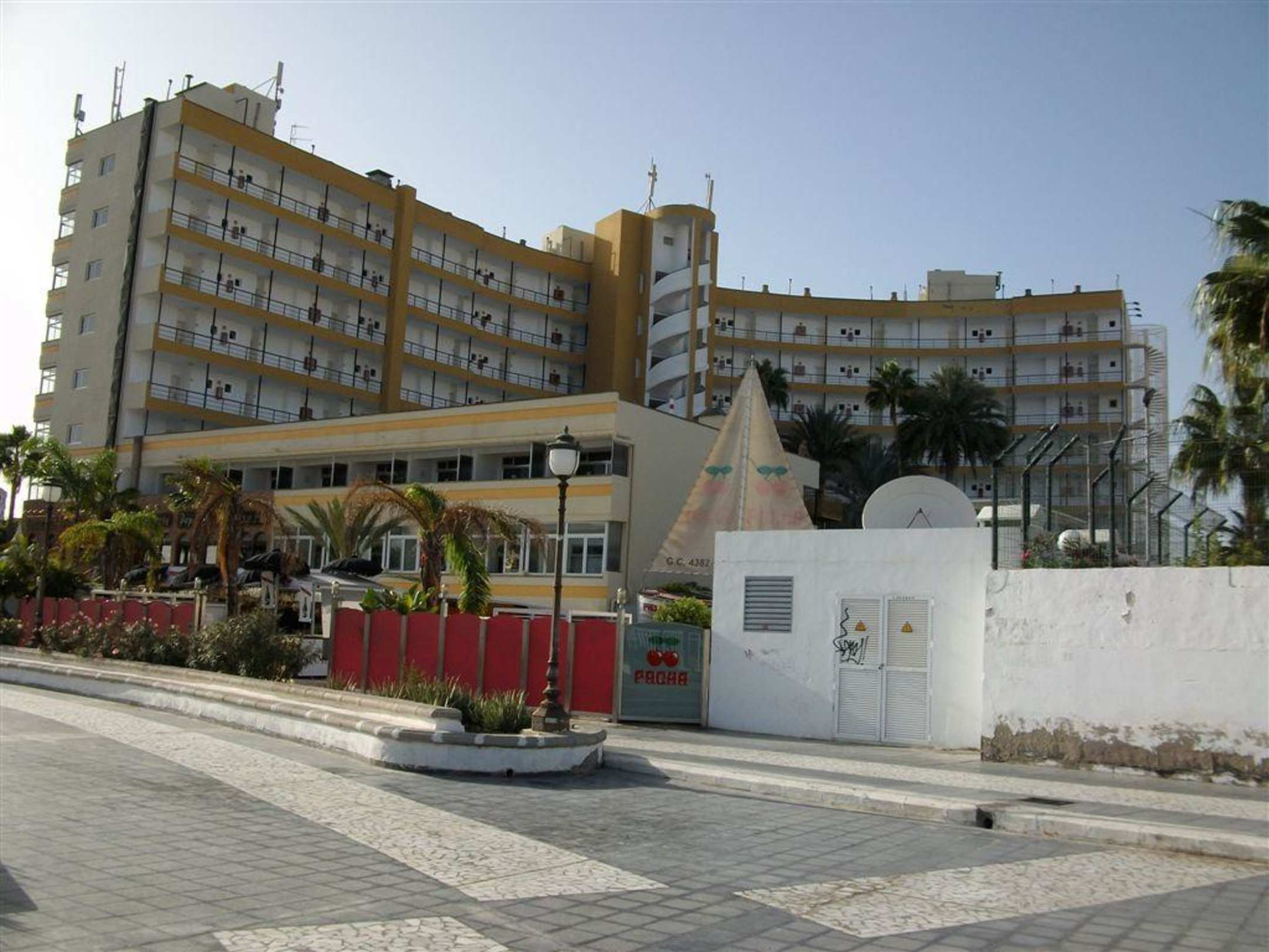 Das Hotel von hinten. Man sieht die "Laubengänge" Die Zimmer haben alle Aussicht nach vorn. Im vorderen Teil ist der niedrige Anbau mit den "Low cost Zimmern"