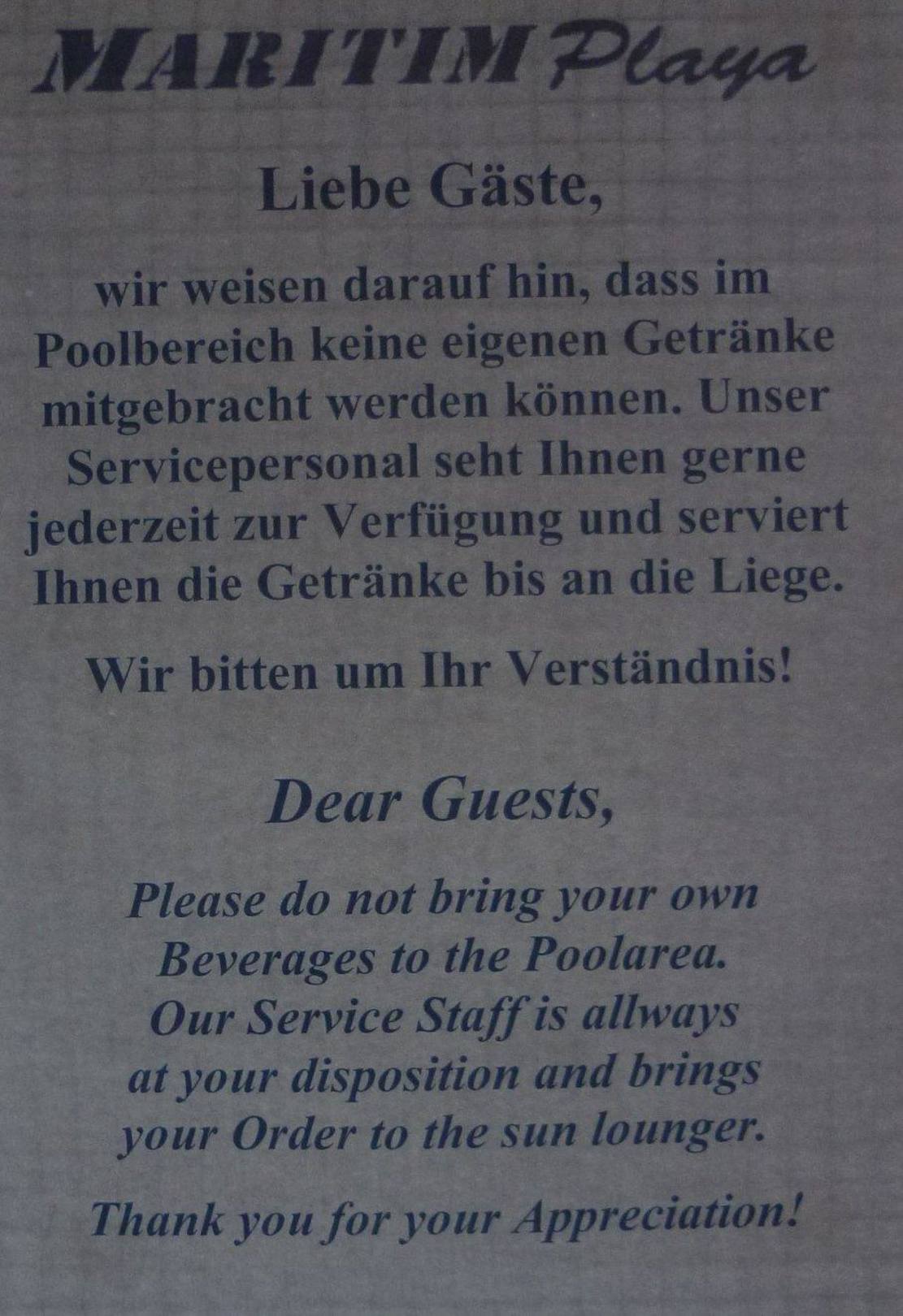 Wir haben insgesamt 10 solcher und ähnlicher Verbote gesehen. Im Fahrstuhlaufzug, an und um der Bar.