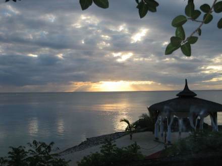 SonnenuntergangEs wird dunkel auf Mauritius, im Vordergrund Blick auf die am Strand gelegene "Hochzeitskapelle"...