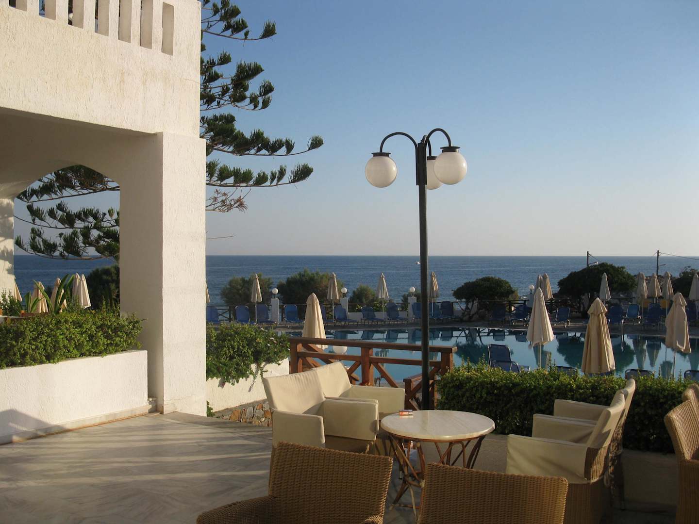Vom Ausgang des Foyers auf den PoolLinks sieht man einen Teil der Außenanlage, wo Frühstück und Abend gegessen werden kann