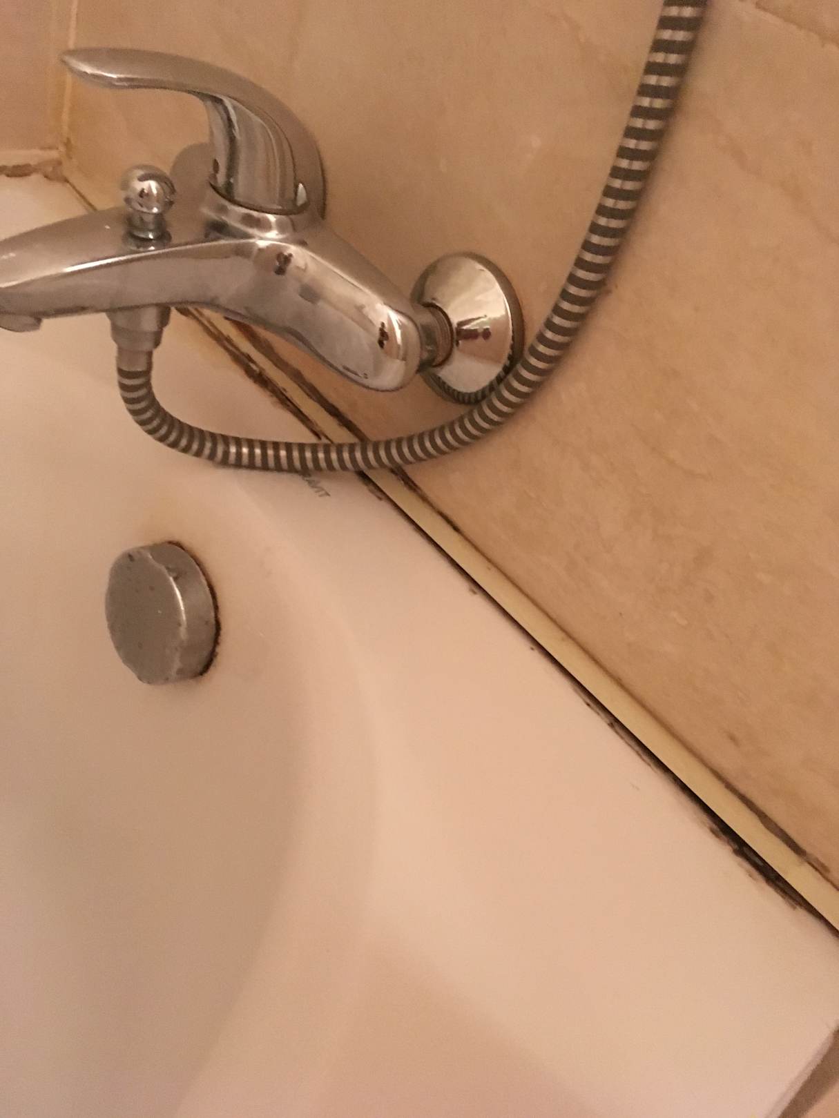 Unter dieser weißen Kante war etwa einen halben Zentimeter hoch Schimmel rundum die Badewanne. Und das war bereits das zweite, bessere Zimmer, mit weniger Schimmel...