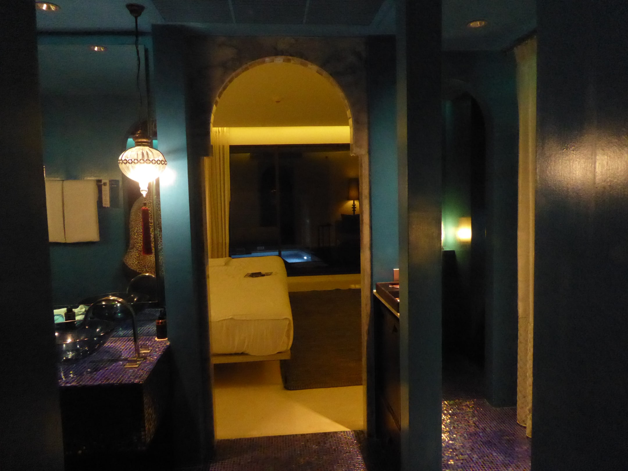 Blick in das Zimmer mit beleuchtetem Innenpool