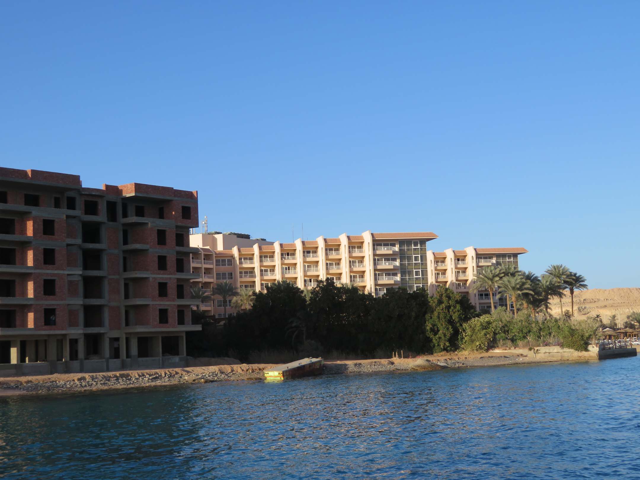 Blick vom Nachbarhotel/Steg auf den Neubau und Marriott