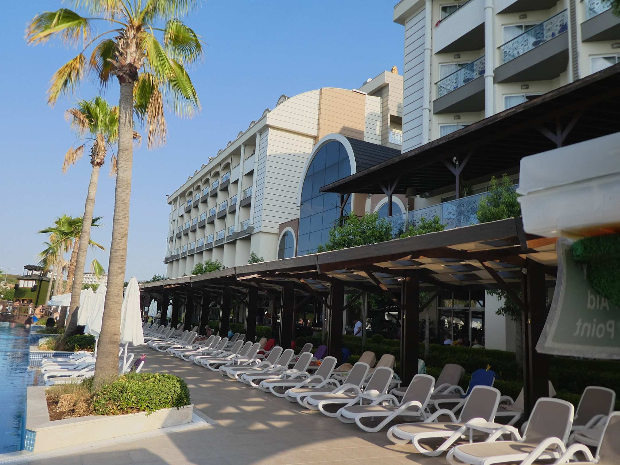 Hotel vom Pool aus und Liegestühle am Pool