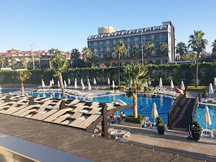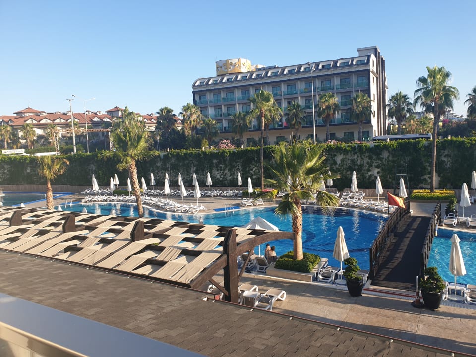 Der Ausblick von unserem Balkon. Links sind die Rutschen und rechts befindet sich die Bühne und Grünfläche. Auf dem Bild selber ist aber nur ein Teil des Pools ;).
