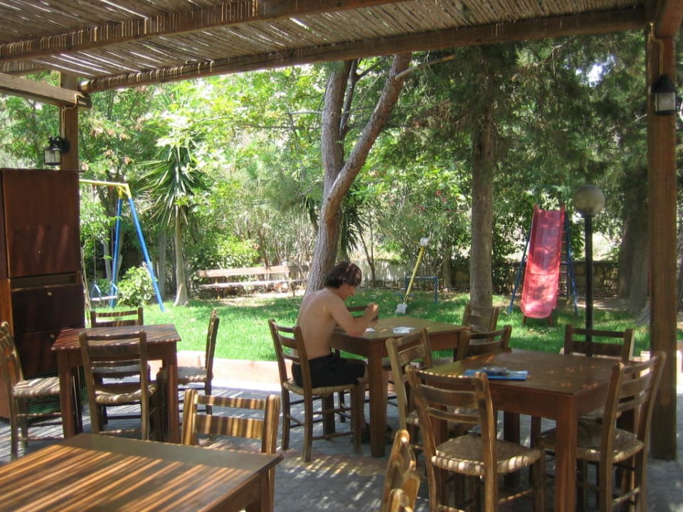 Ansicht von Poolbar und SpielplatzHinter mir befindet sich der Pool und zu meiner Rechten das Hotel. Es ist alles wunderschön begrünt.