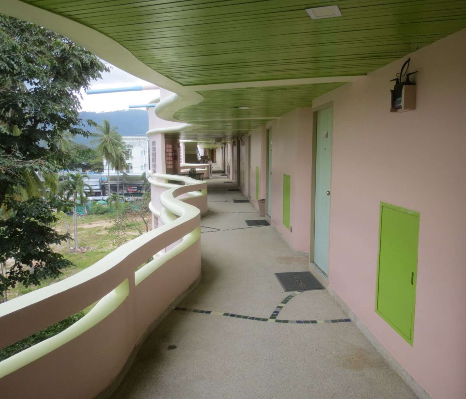 Außengang mit den Zimmertüren.