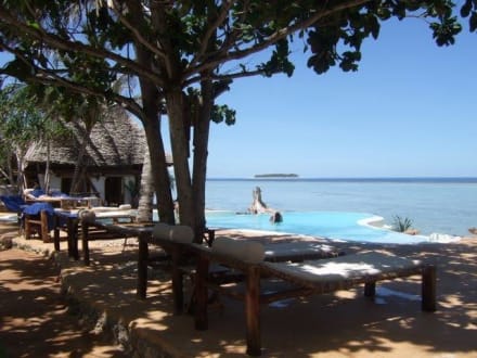 Schattiger Pool mit Aussicht/enIm Hintergrund die kleine Hotelinsel Mnemba - Ansehen kost nix - anfassen ab $ 999,- je Nacht, natürlich p.P.