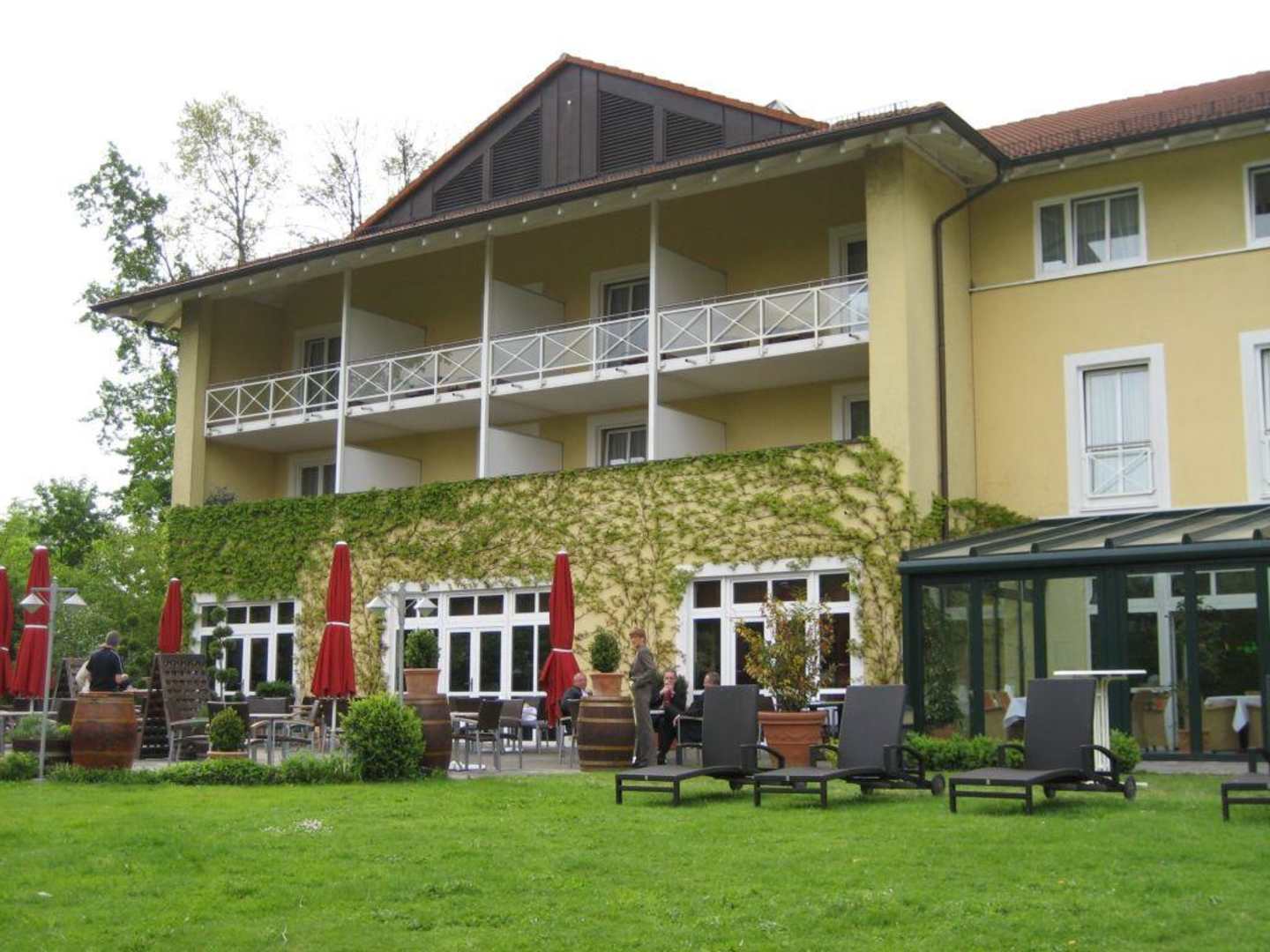 Bei schönem Wetter kann man auf der Terrasse mit Blick auf den Stadtparkteich frühstücken - herrlich! Die Liegestühle und Strandkörbe stehen allen Hotelgästen zur Verfügung