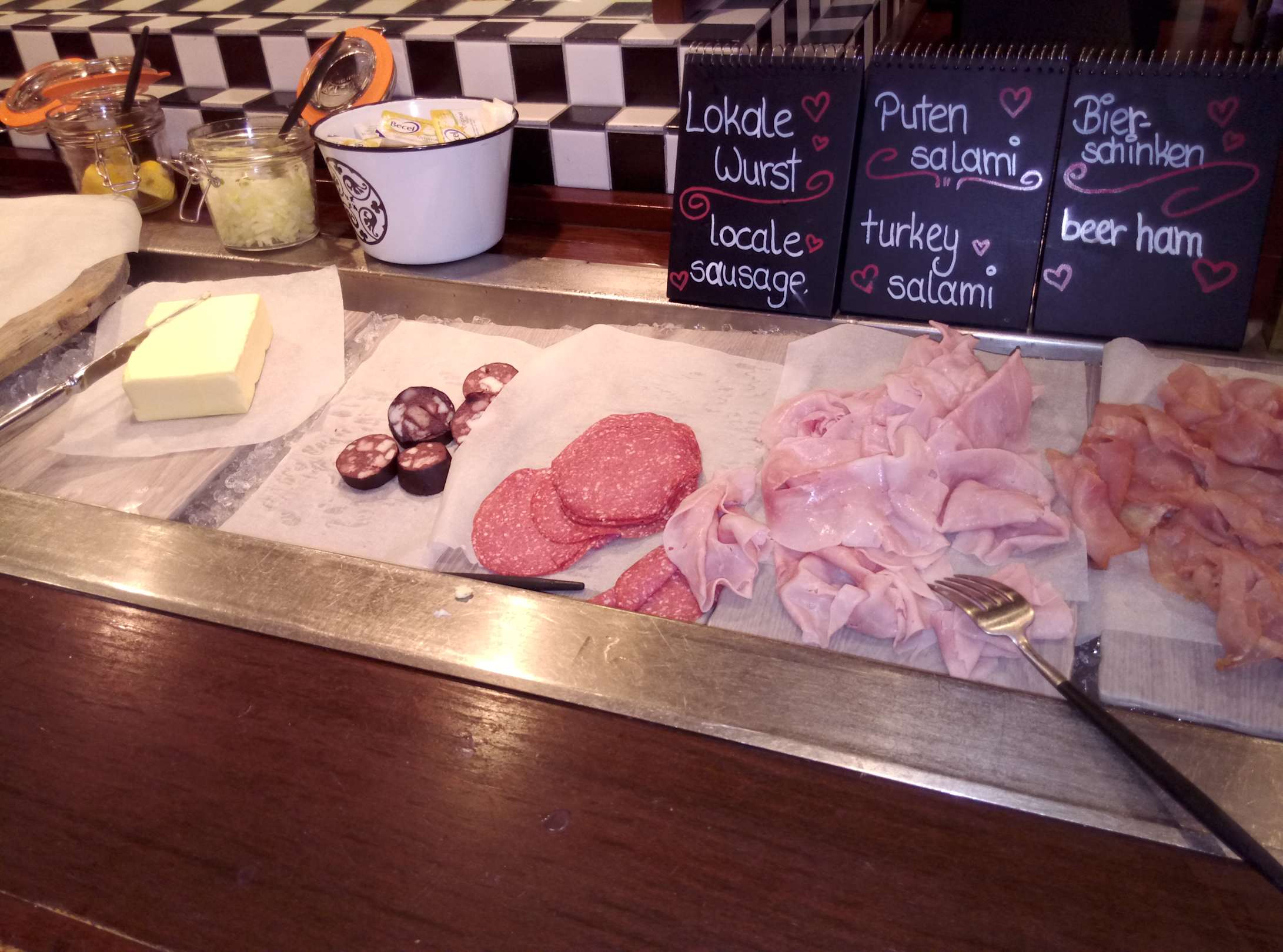 GastroWenig Auswahl an Wurst. Butter nur noch am Stück. Jeder Gast werkelt daran herum. Stückweise ist es hygienischer.