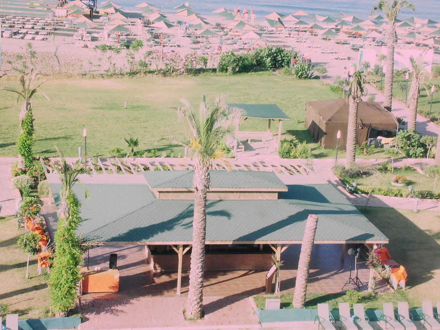 Hier die Strandbar nit Blich zum Strand, vom Zimmer aus aufgenommen