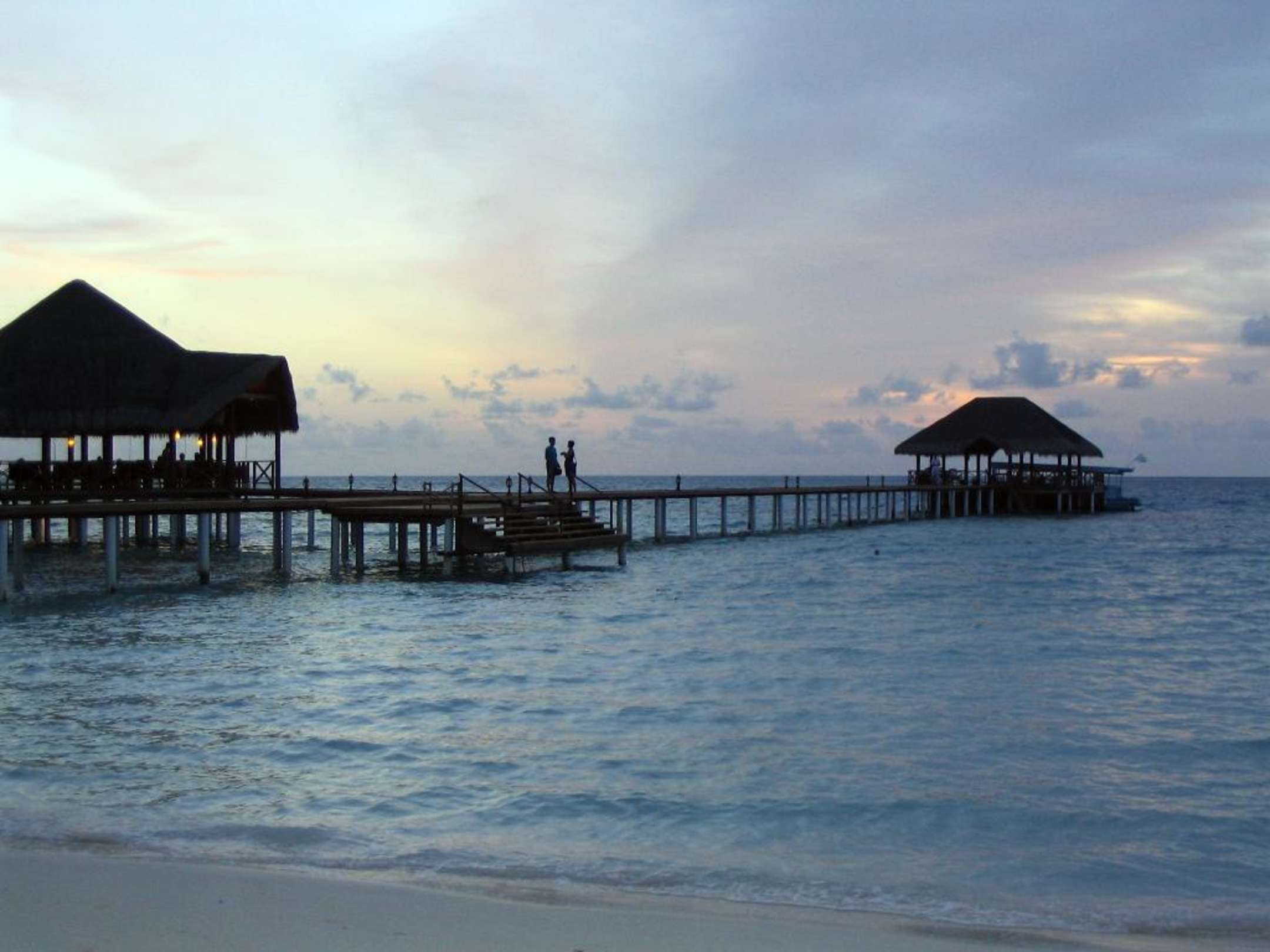 Malediven_Medhufushi_Landesteg im SonnenuntergangBei Ankunft mit dem Wassertaxi landet man zuerst mitten im Wasser auf einem etwas größerem " Floss" . Danach geht es mit dem Dhoni etwa 10-15Min zum Landesteg der Insel.