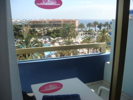 Blick vom Zimmer auf Pool & Meer