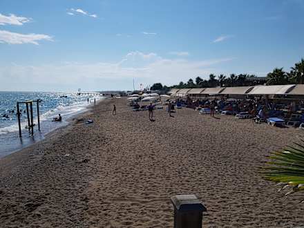 Der Sandstrand, zum Wasser hin Kies.