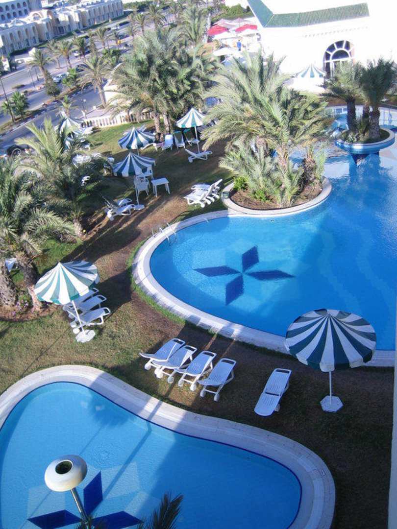 Blick vom Zimmer auf den Pool