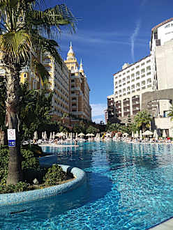 Blick vom Pool zum Hotel Melas