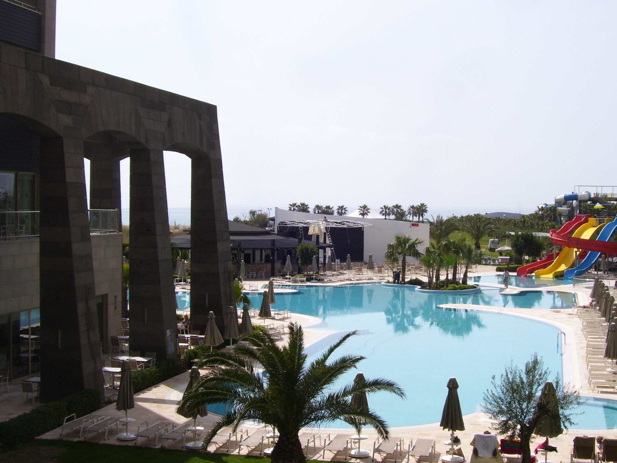 Blick vom Zimmer über den Pool Richtung Meer