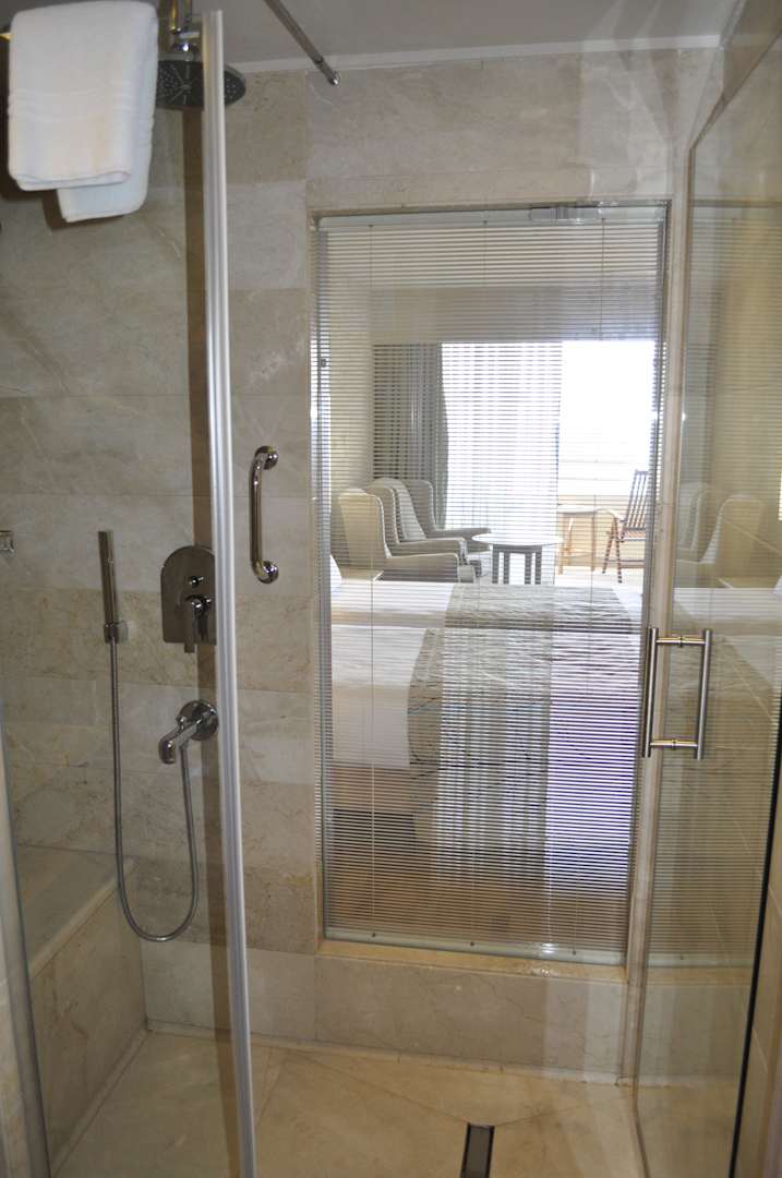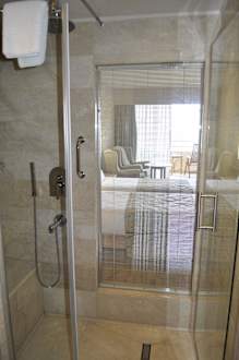 Regenwalddusche mit Blick ins Zimmer