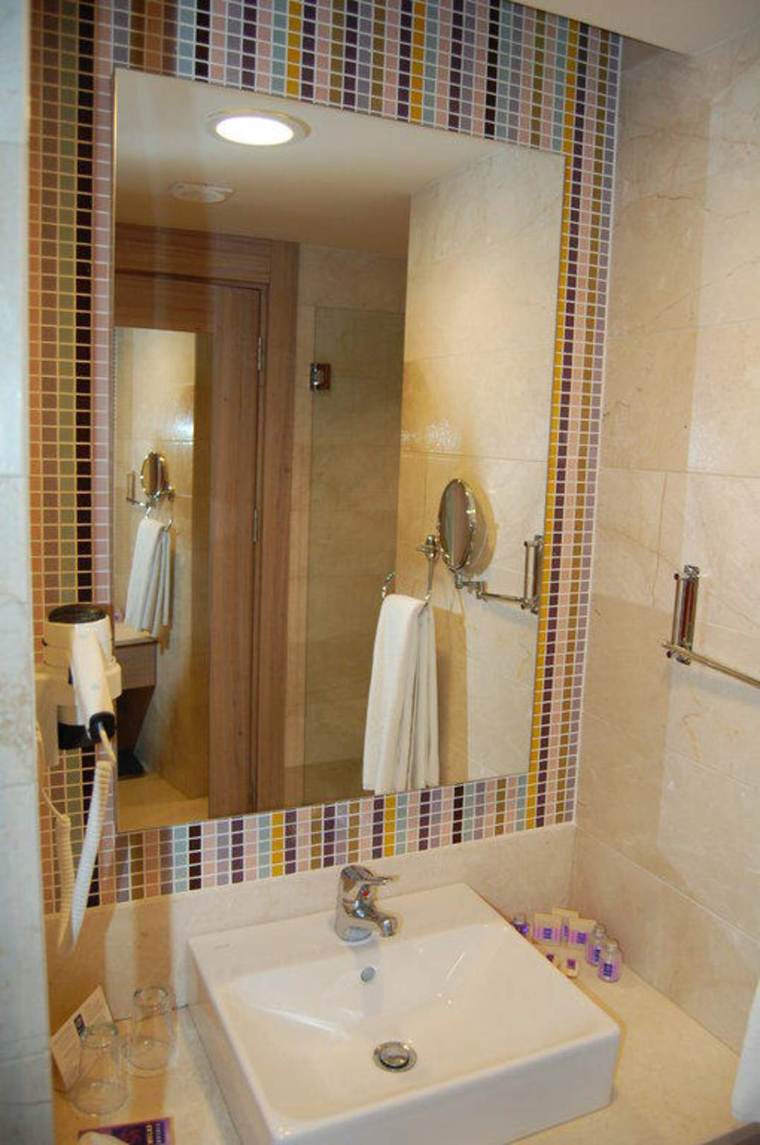 Schöne Mosaikoptik im Bereich des Waschbeckens