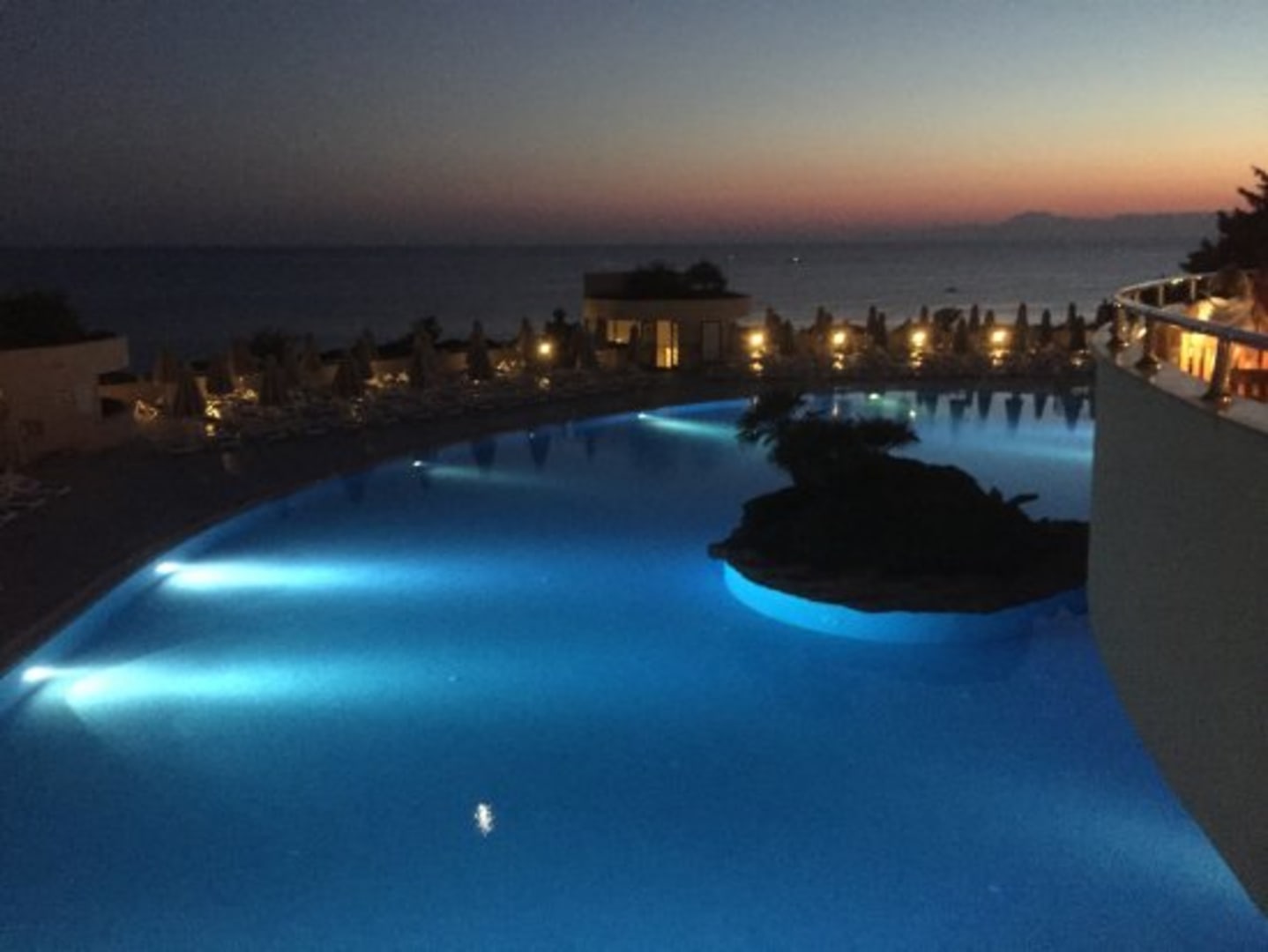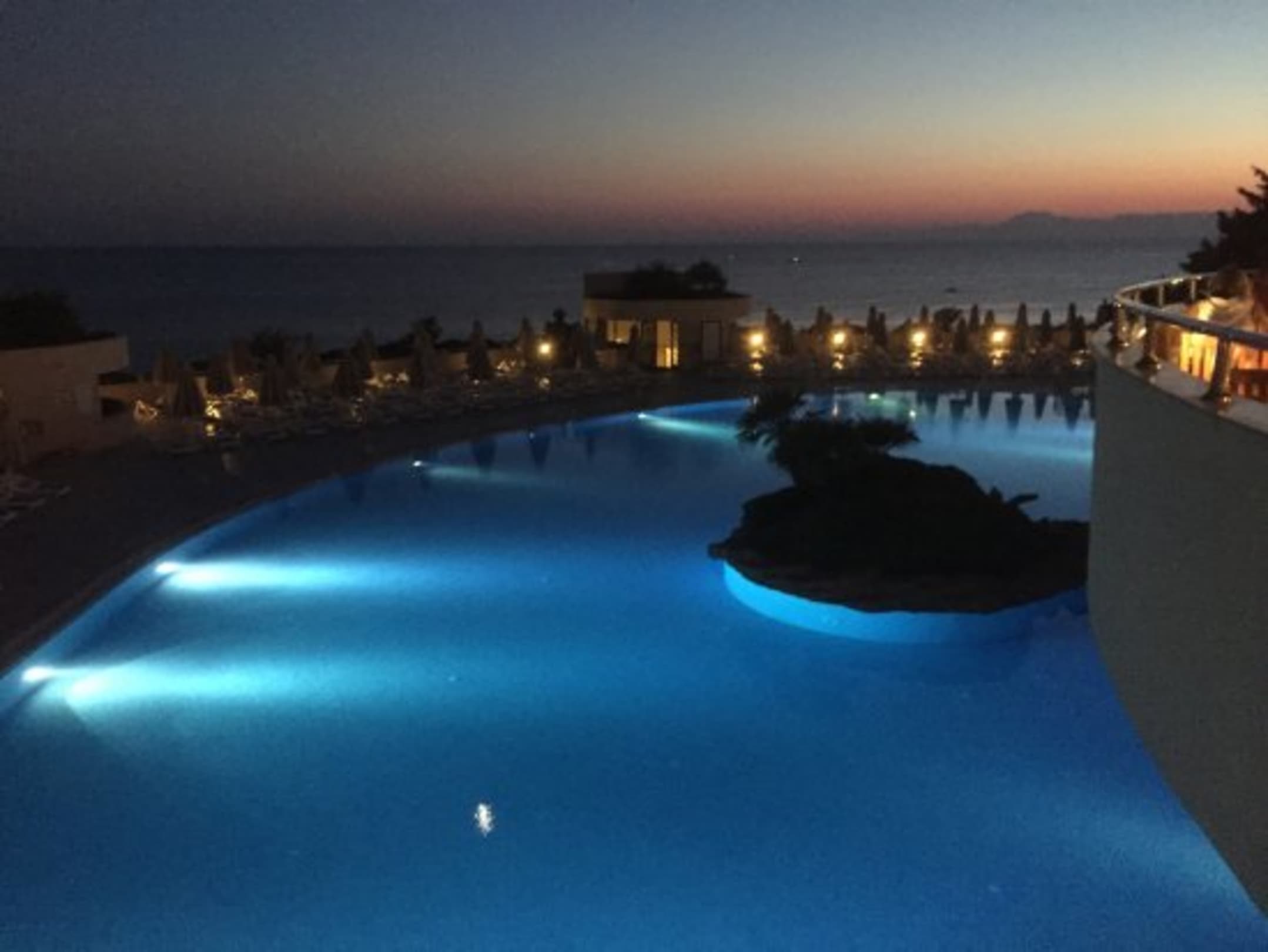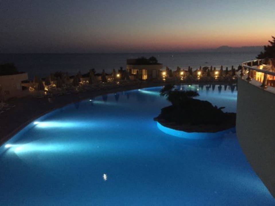 Blick vom Außenbereich des Restaurants zum Pool und Meer am Abend.