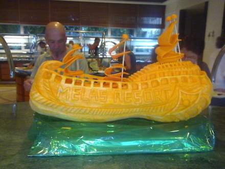 Liebevolle Schnitzerei aus einer Melone am Abendbuffet.