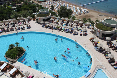 Ausblick vom Balkon auf den Hotelpool