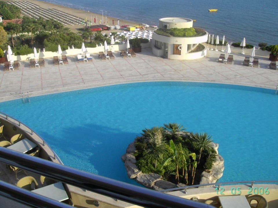 Blick vom Zimmer zum Pool und Strand