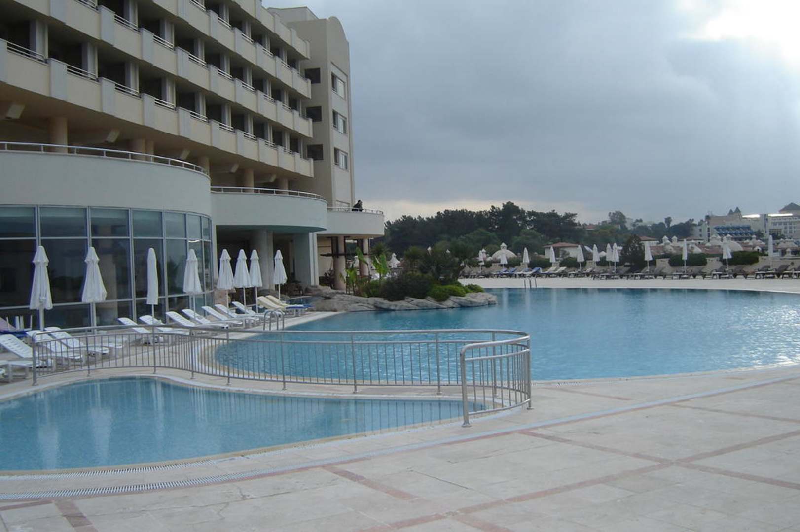 Poolanlage morgens um 8Die Poolanlage befindet sich im 4 Stock des Hotels. Von dort kann man auch mit den zwei Fahrstühlen oder über Treppen zum Strand gelangen. Da das Hotel nicht ausgebucht war, konnte man immer einen schönen Platz auf der Liege bekommen.