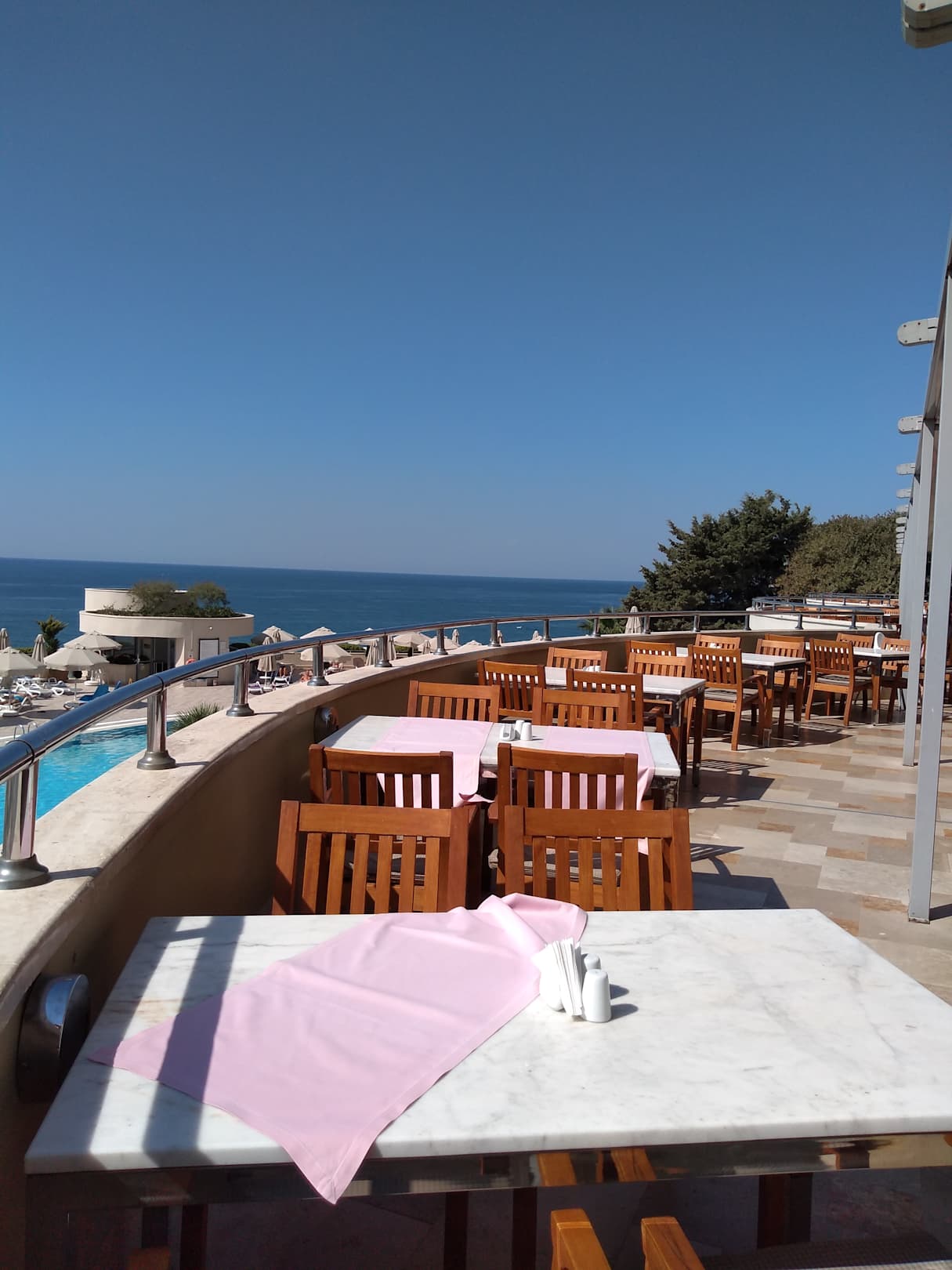 Herrlicher Blick auf den Pool und das Meer von der Terrasse aus.
