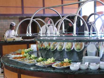 Salatbuffet, im Hintergrund ist der Bereich des "Livecooking" zu sehen