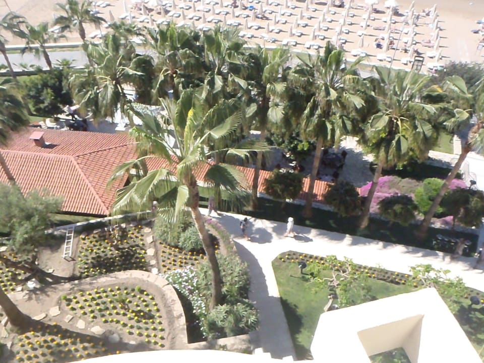 Blick vom Aufzug auf den Strand und Garten