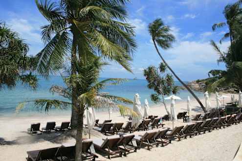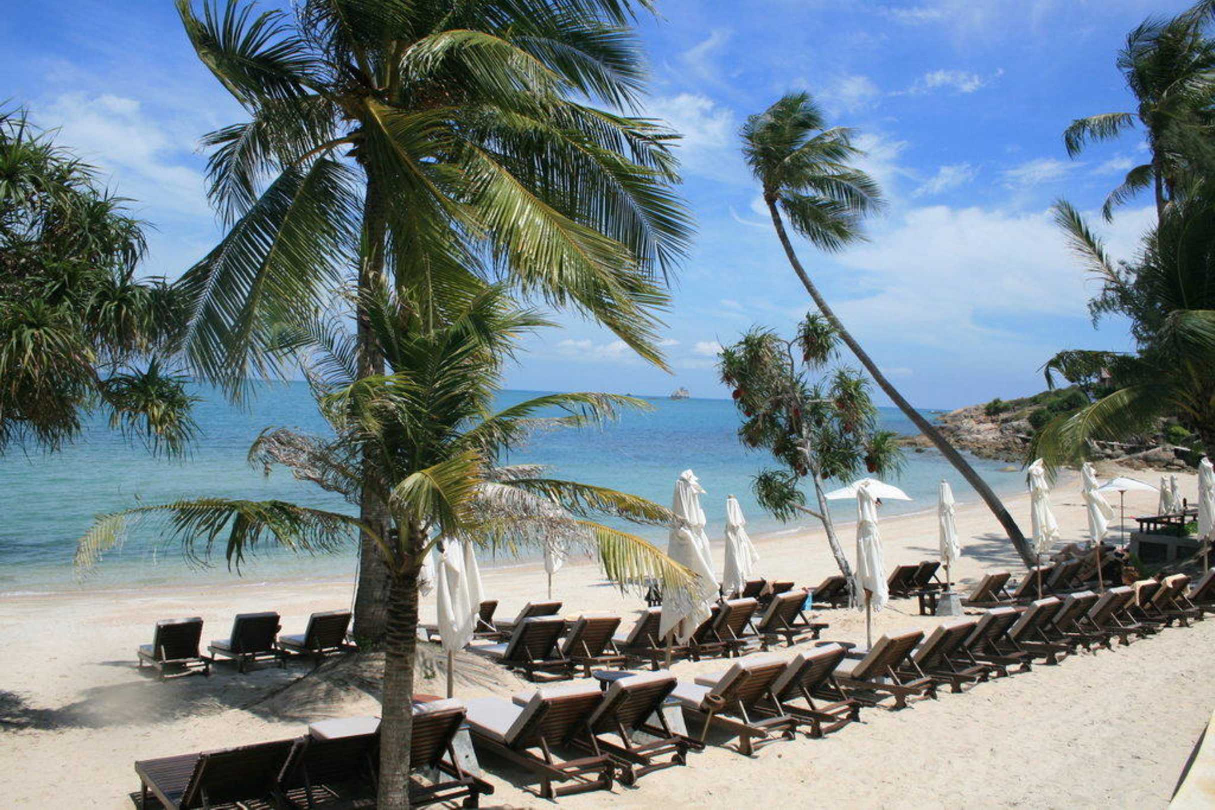 Strandliegen vom Pool aus gesehen